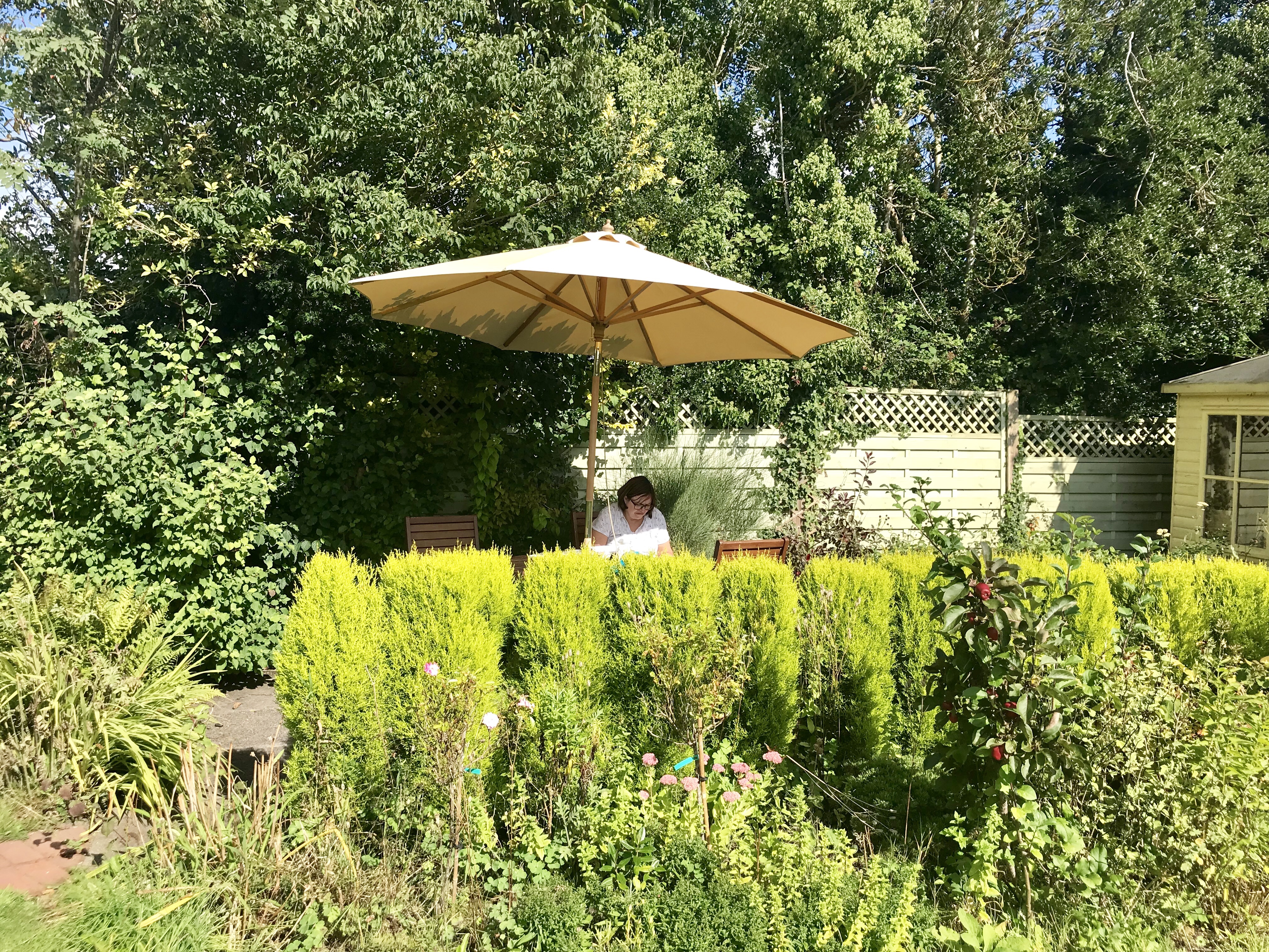 Sally relaxing in the garden, doing some of the change of address stuff.